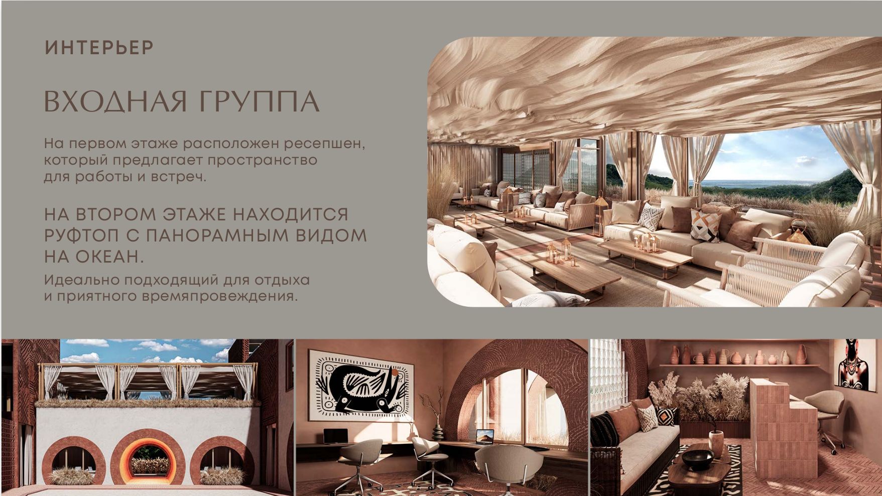 Естественный свет и теплые песочные тона в сочетании с этническими деталями создают уникальную атмосферу виллы.